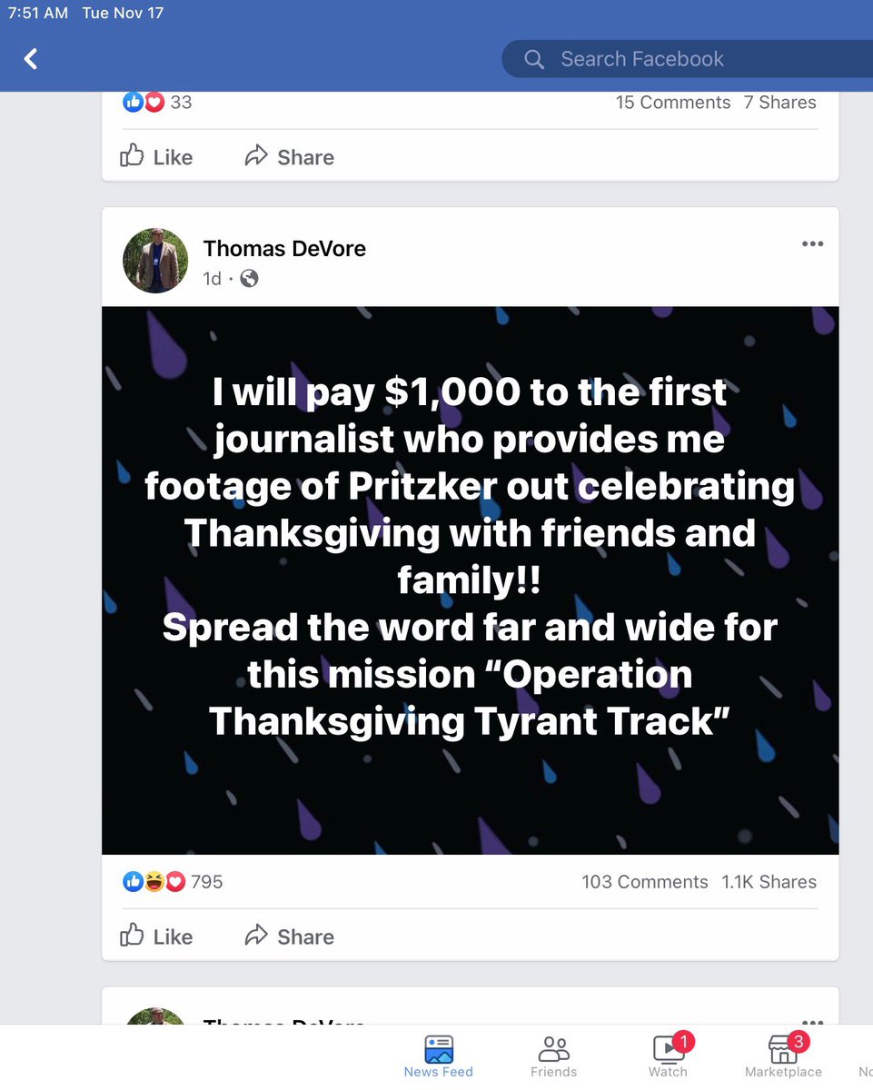 Then there was this FB post from the ambulance chasing lawyer who has gone all around IL trying to invalidate the Governor’s Covid orders (unsuccessfully - he’s been beaten in almost every case) - offering $1000 bounty for pics of the Gov celebrating Thanksgiving with his family