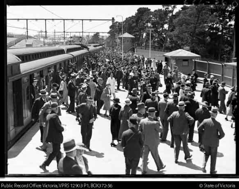 Flemington Racecourse (FR) station opened 1861 by Melbourne and Essendon Railway Company. Closed 1864, reopened in 1867 by VR. The FR line electrified 1918 for testing of electric trains, the first line to be sparked.