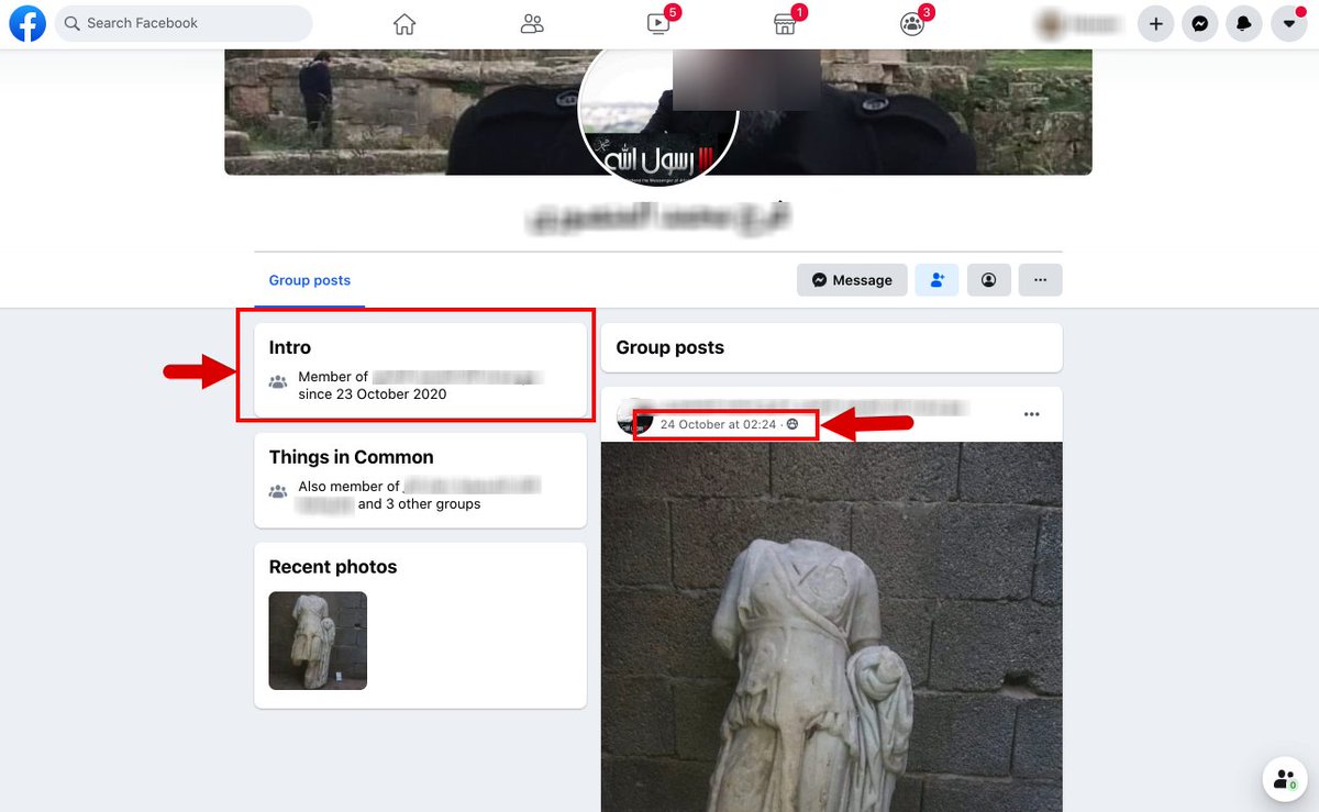 Facebook data shows that the user had only joined the group one day before he posted the Greco-Roman statue.