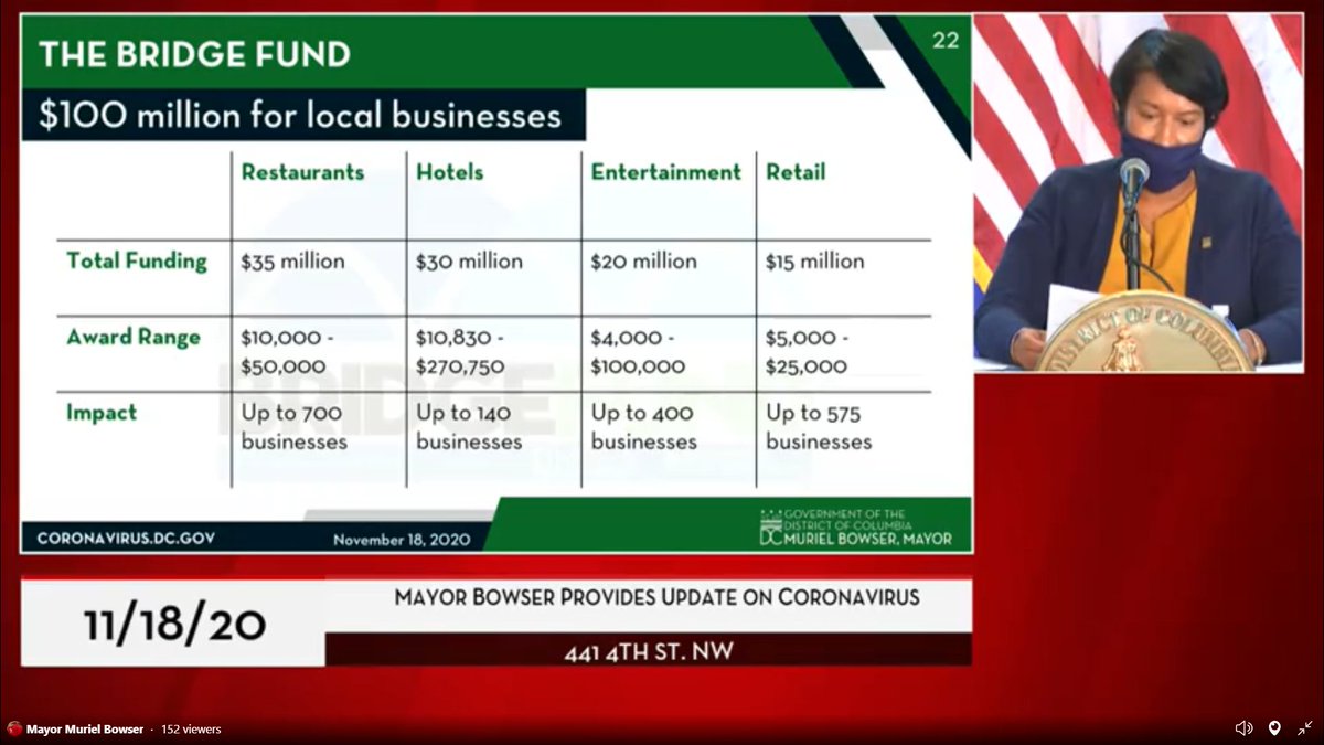 This is how Bowser is going to split up a $100 million business relief fund authorized by the council. 15% of the pots for restaurants and retail are reserved for businesses run by residents and with majority female/POC ownership