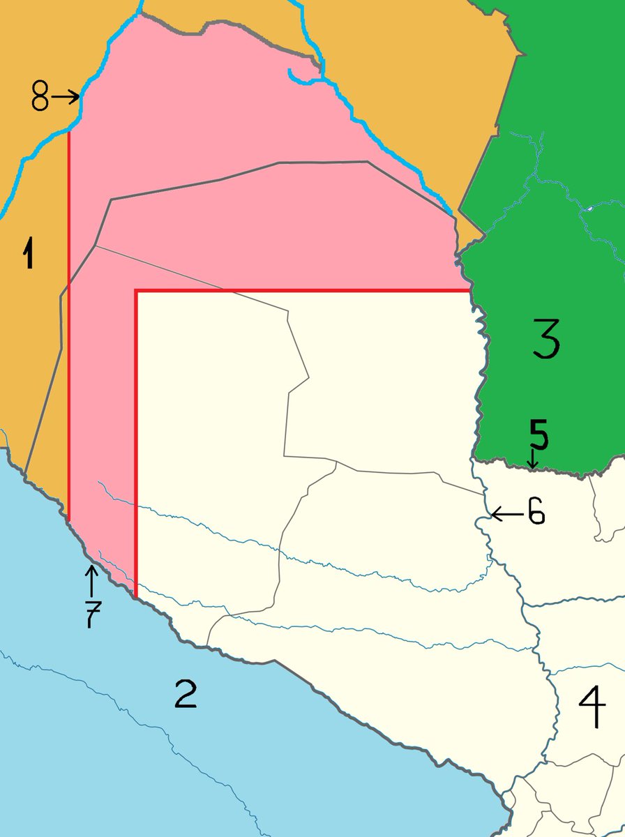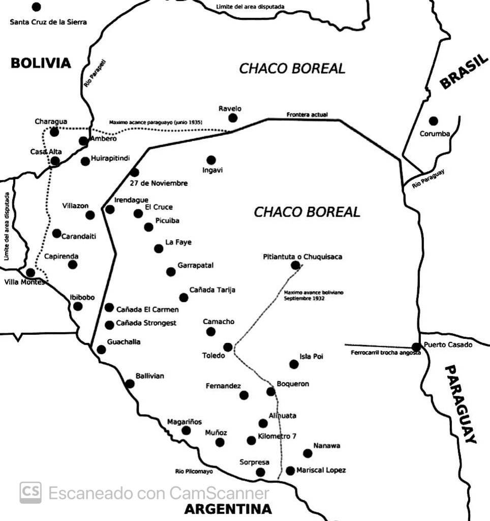 esas líneas. Bolivia lo violó sistemáticamente. Ahora vamos al después de la guerra. Fíjense en el mapa. Ahí se muestra hasta dónde llegó Paraguay, y a la vez dónde estaba al final de la guerra. Paraguay, contrario a lo que cree la mayoría, ya no estaba sobre el río Parapiti,...