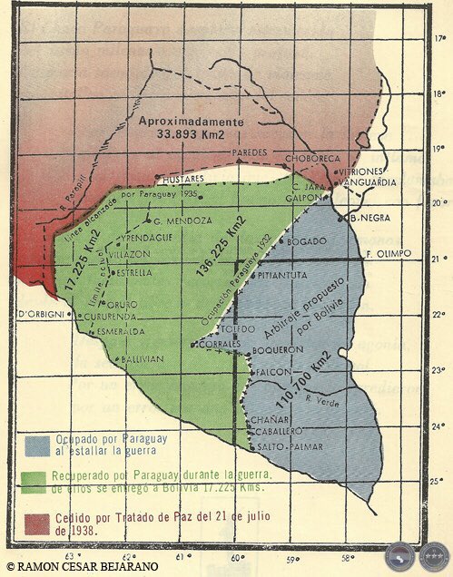 estaba a varios kilómetros por debajo y en repliegue. Vamos a los números. Paraguay recuperó por las armas 150.000 km2. Cuando se sentó a la mesa de negociaciones, cedió 17.000 km2. Bolivia hizo lo mismo con casi 10.000 km2. ¿Para qué? Para que Paraguay tenga sus límites lejos...