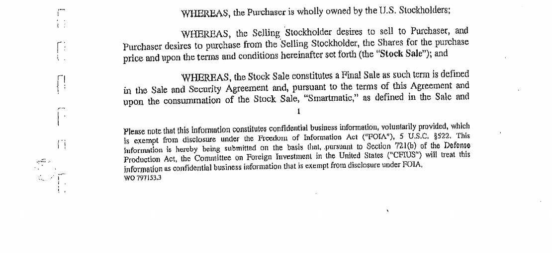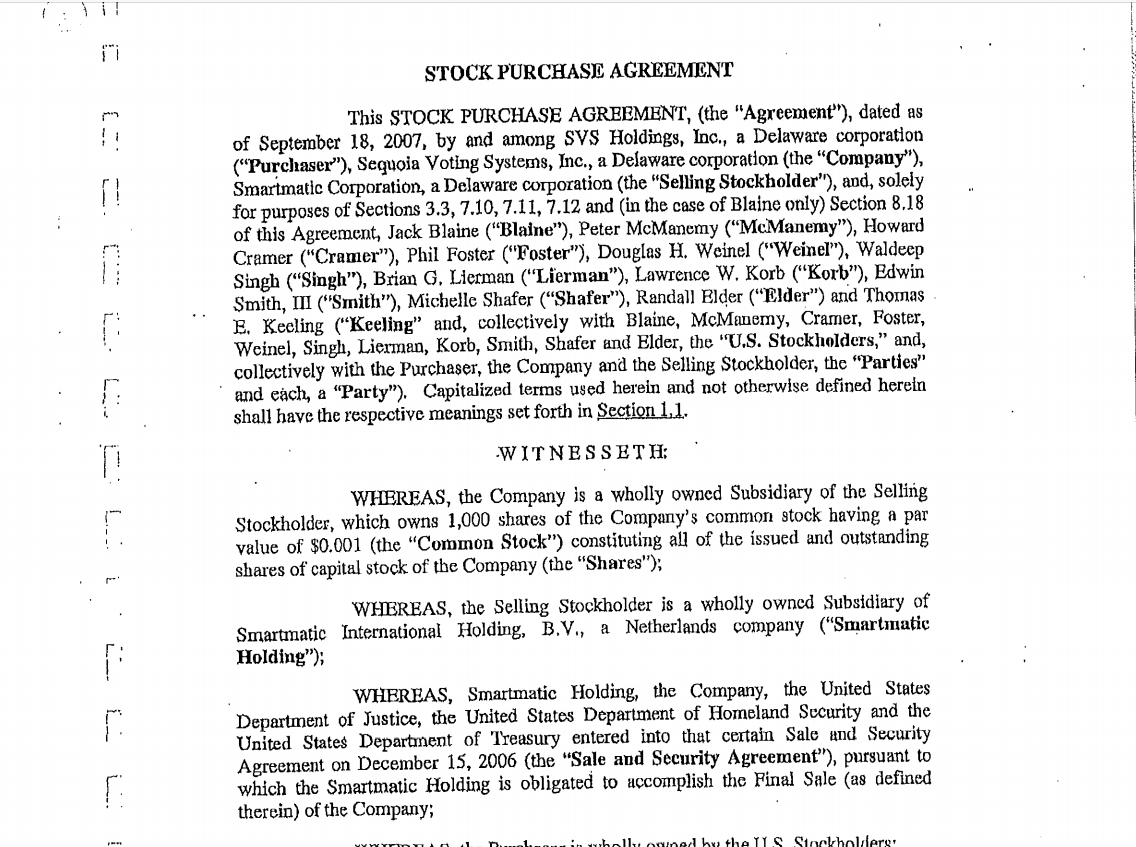 The sale of Sequoia to its Sequoia management. While in the agreement Smartmatic Venezuala retains all Proprietary Intelligence (software) for our voting machines.
