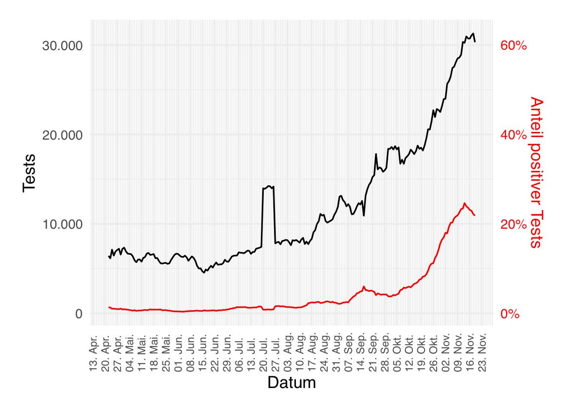Noch eine Anmerkung: Die heute gemeldete Zahl positiver Tests ist 9147, gestern waren es 9198. Das schaut nicht nach schlimmen Datenfehler aus. Die Zahl ist aber
