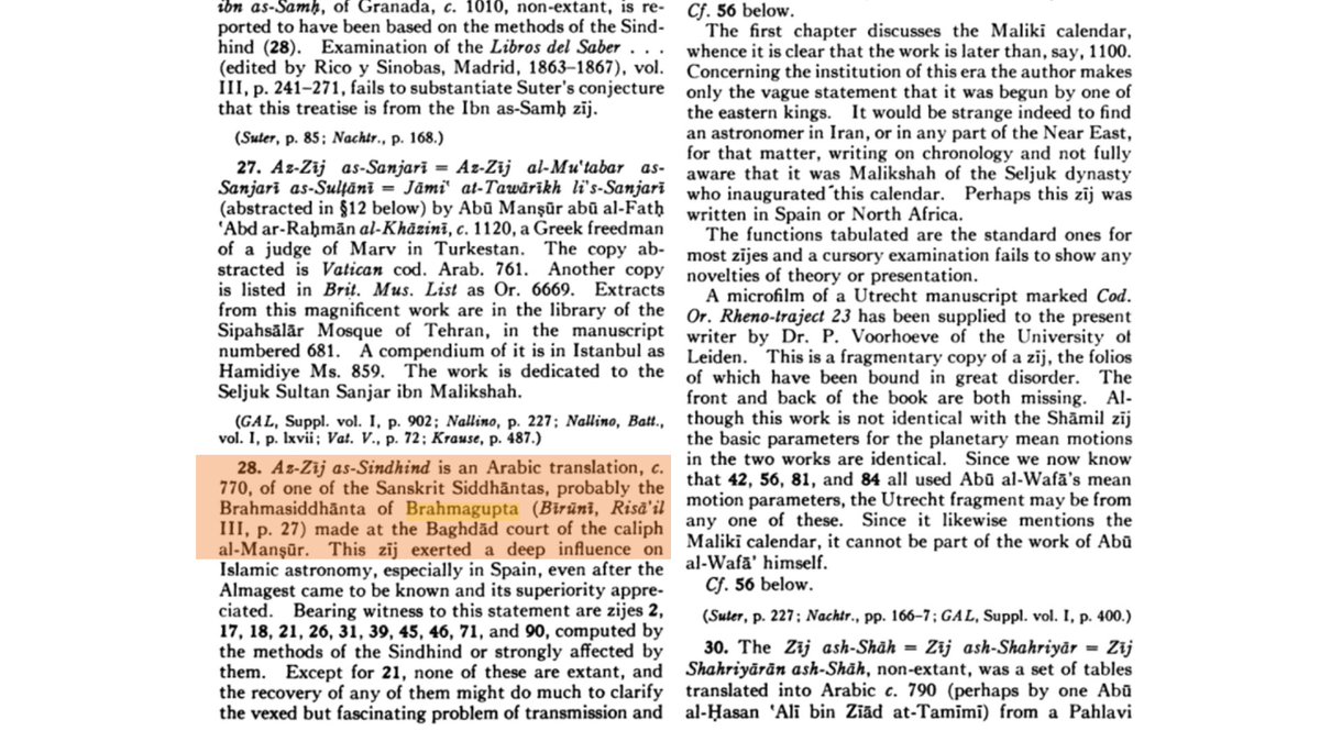 2/n The Brahmasiddhānta of Brahmagupta (6-7th Cen) was received in the court of Al-Mansur(8th cen).