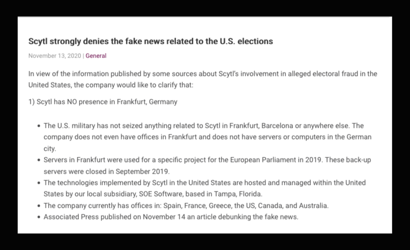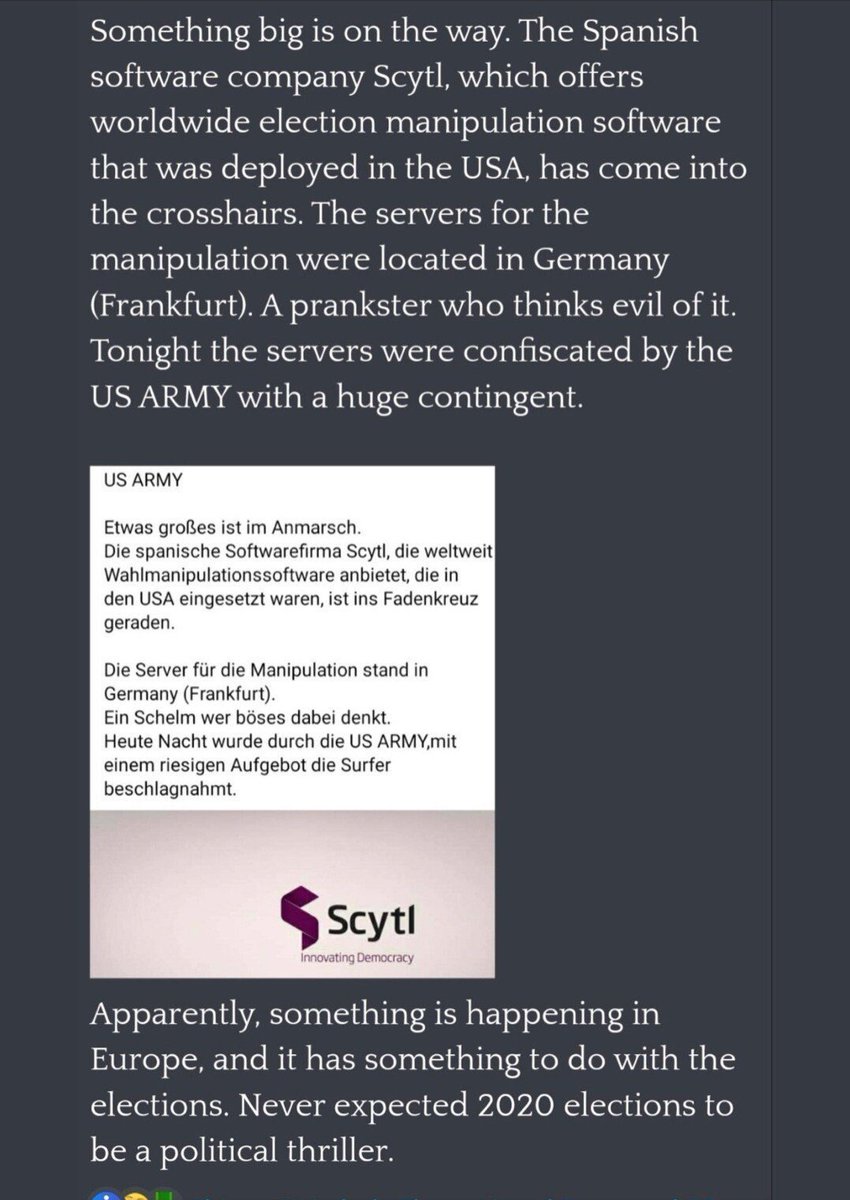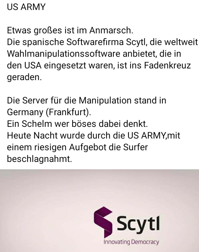 On November 11, Spanish website AlertaNacional.es likewise reported that US Army operators had raided a Spanish company in Frankfurt, seizing computers containing evidence of U.S. voter fraud.