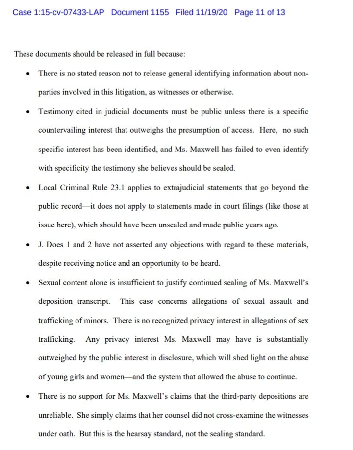 For all of the foregoing reasons, Intervenors respectfully request that this Court unseal sealed materials and their related submissions, as well as all docket entries that received no objection. Intervenors request that the J. Doe 1 transcript be released immediately