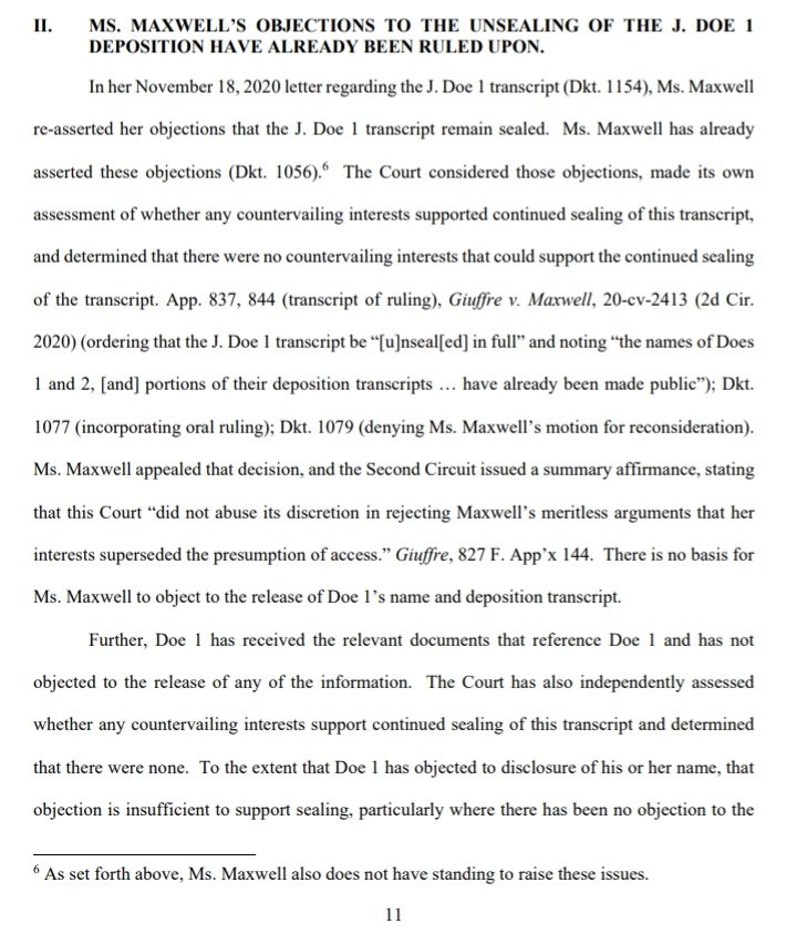 Objections to Unsealing Sealed Materials and to the objections raised in Ms. Maxwell’s November 18 letter regarding J. Doe 1