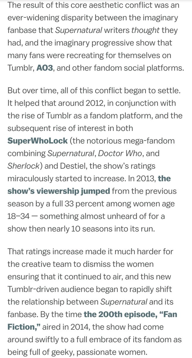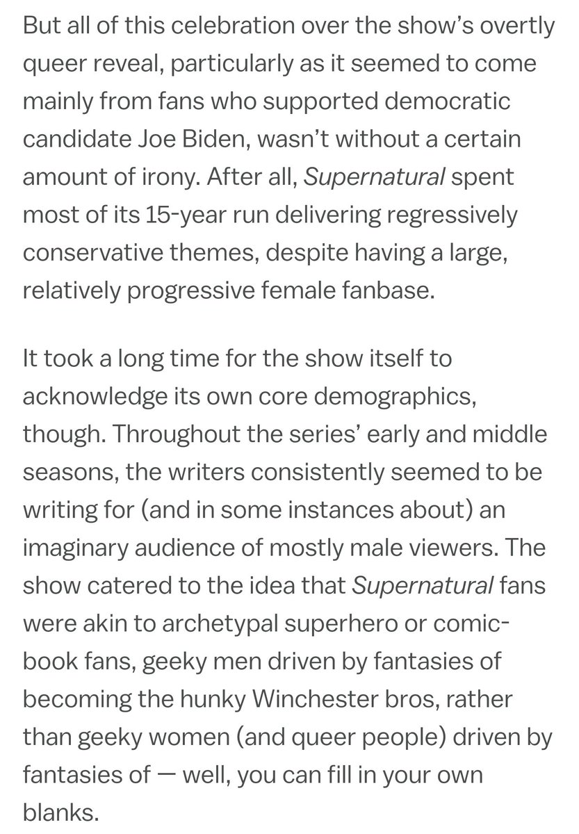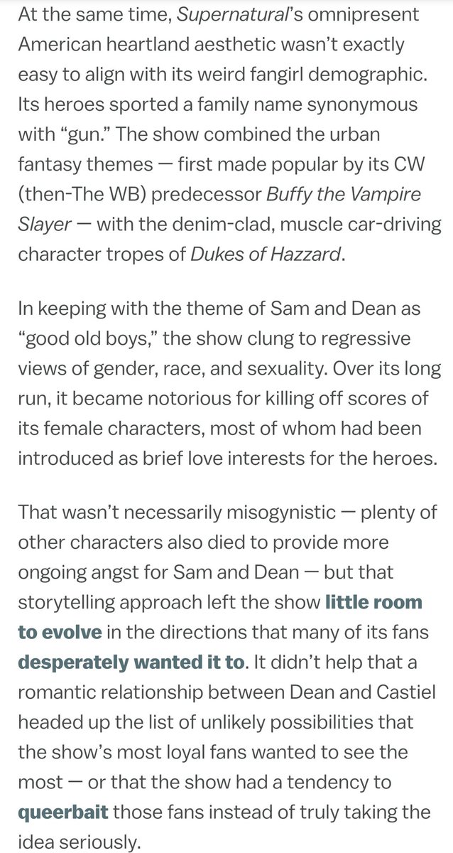 It's interesting to me, although very typical, how this article about the "Supernatural" finale completely conflates aesthetics and representation. google.com/amp/s/www.vox.…