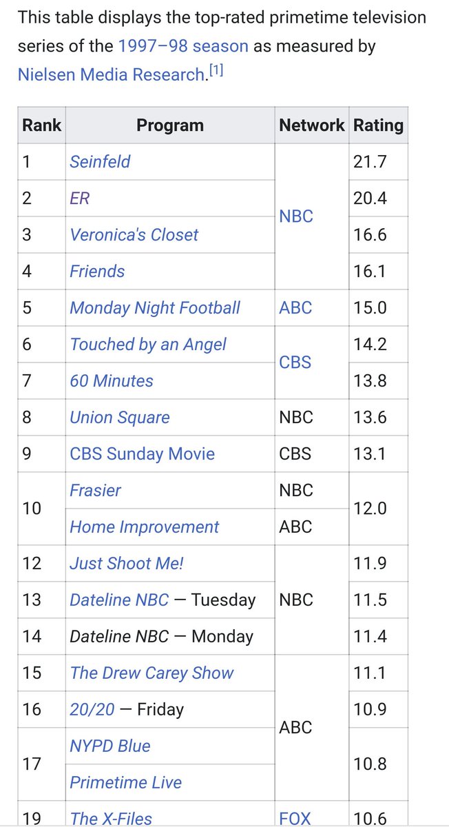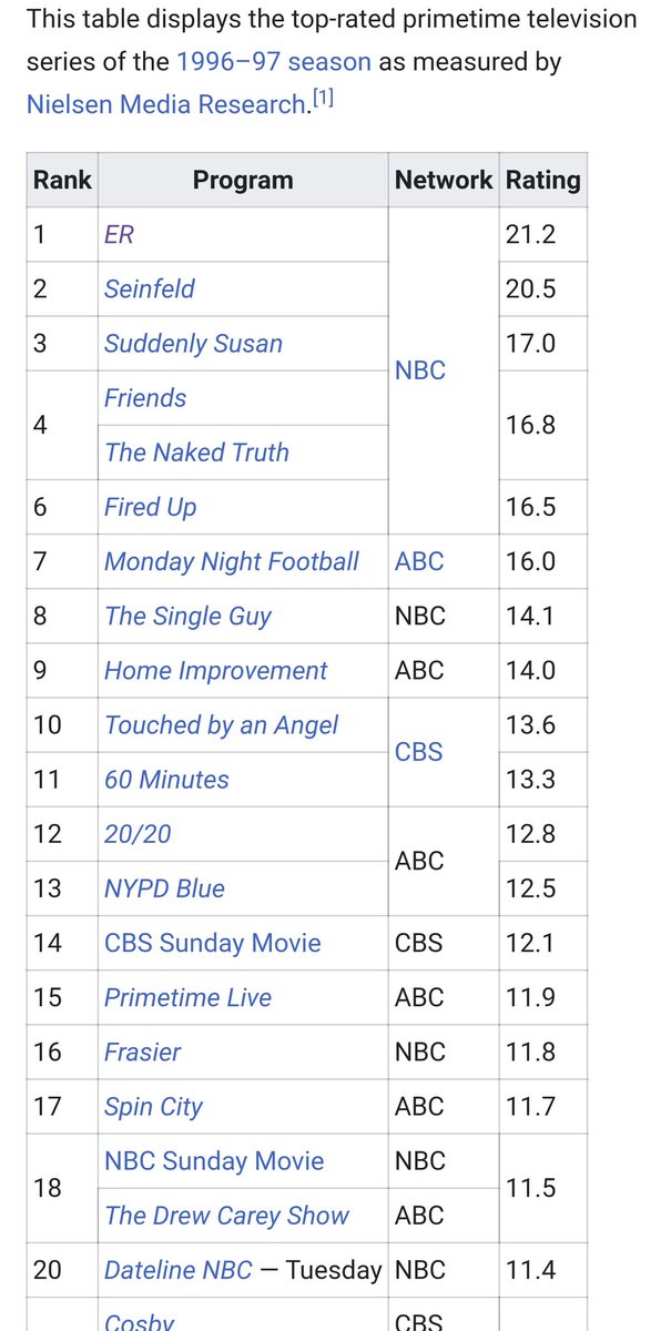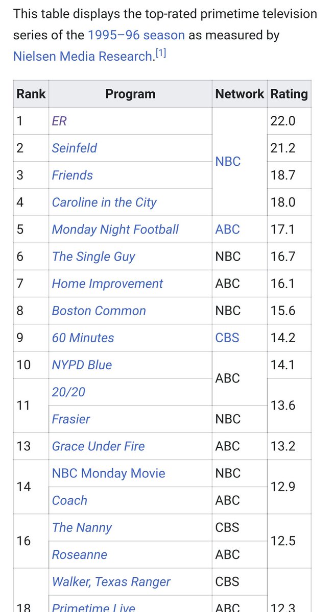 Boy NBC was just printing money back then. Just stick literally anything on Thursday night before or after one of their other hits, someone will watch it.