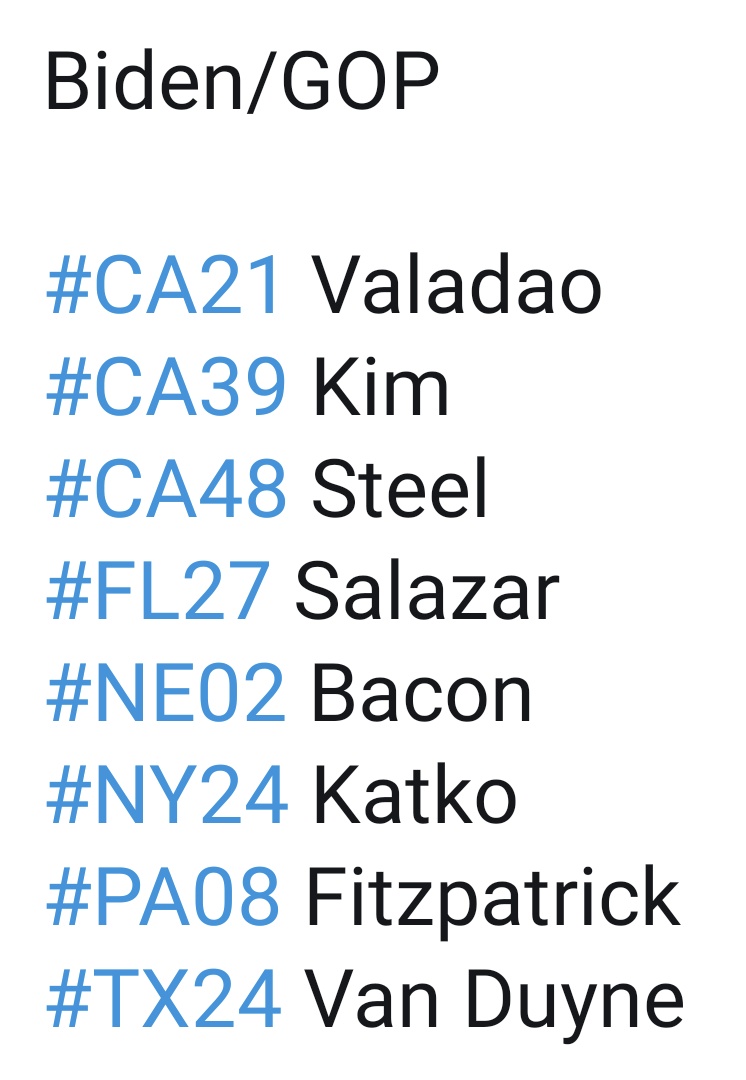 Of the eight Biden/GOP districts so far, four were districts Democrats couldn't even win in 2018 (PA-01, NY-24, TX-24, NE-02). CA-21, CA-39 were wins by 1 and 3 points. So really leaves CA-48 and FL-27.