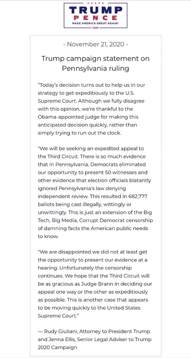 3- Trump avait placé la plupart de ses espoirs. Au bout l’État clé et ses 20 Grands Électeurs. Pour l’occasion, la campagne avait plus ou moins viré ses avocats (certains sont partis d’eux mêmes) et fait appel à son arme absolue : Rudy Giuliani. De retour devant une Cour, Rudy