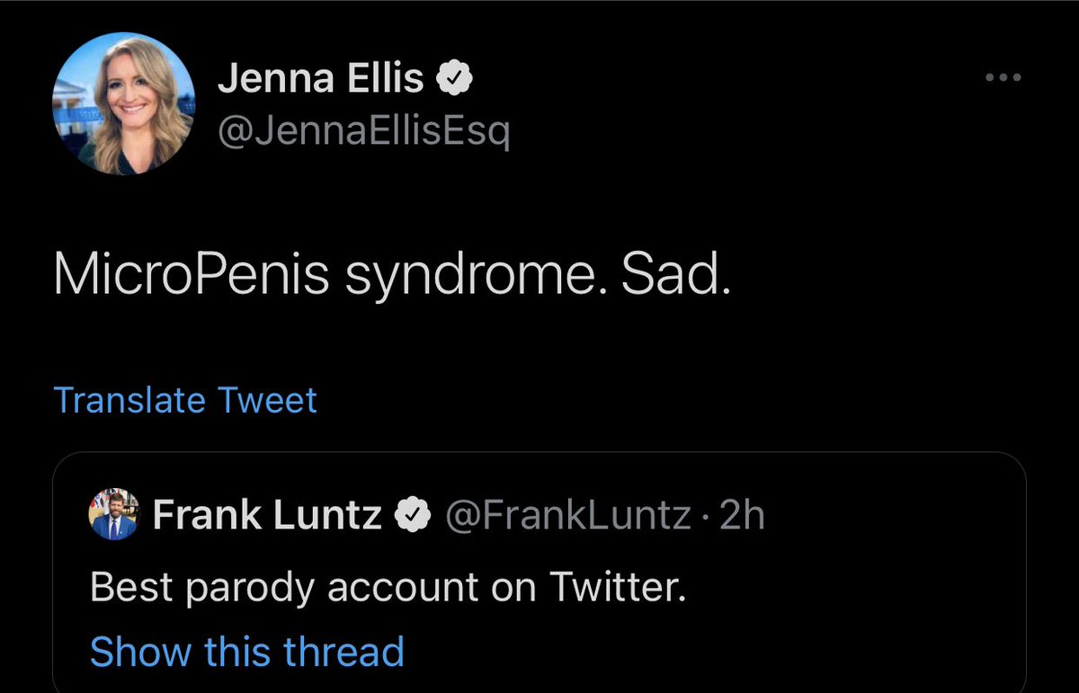12- d’ailleurs dans ce sens. D’abord, Jenna Ellis, l’avocate de Trump (voir tweet 5) a craqué sur Twitter. Répondant à un consultant politique...républicain qu’il était atteint du « syndrome du micro-penis). Et puis il y a eu la réaction de Trump lui-même. Moins drôle et beaucoup