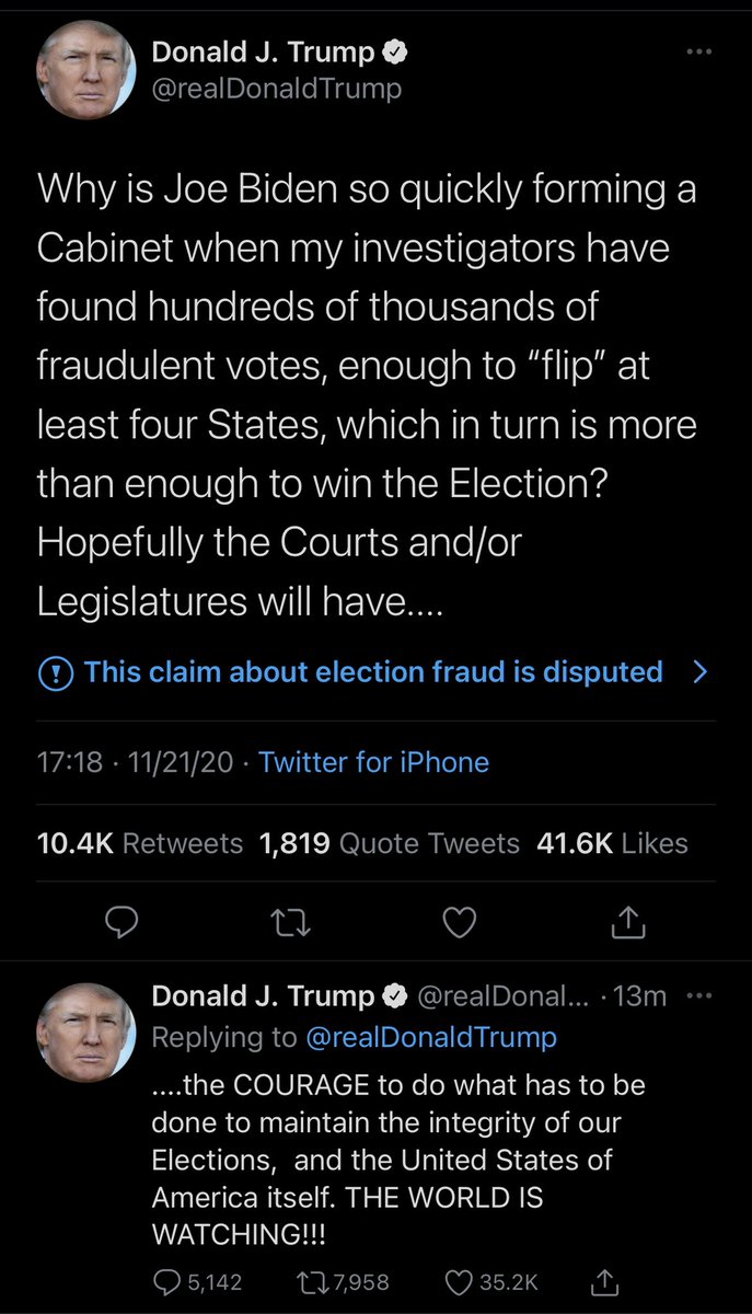 1- Trump n’a aucune preuve. L’ENSEMBLE de ses plaintes confirme le vide de son dossier. Il sait qu’il ne gagnera pas cette bataille là devant des juges. Alors il sème le doute. Et maintenant, c’est évident, veut tenter un passage en force. Qui ne fonctionnera pas mais laissera