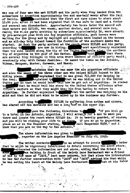 CASI 70 AÑOS DESPUÉS - EL FBI DESCLASIFICA DOCUMENTOS QUE SUGIEREN EL ESCAPE DE HITLER A LA ARGENTINA