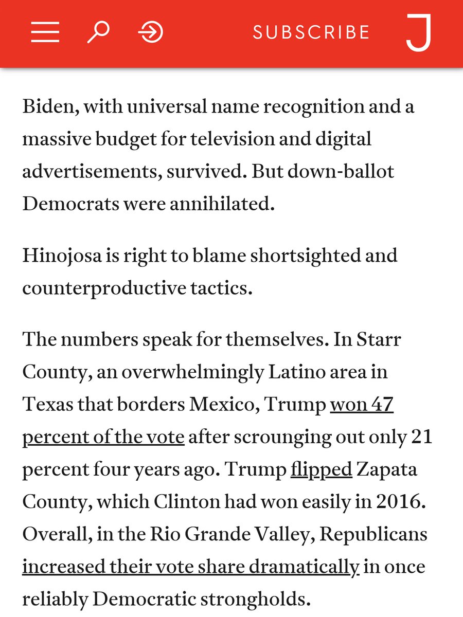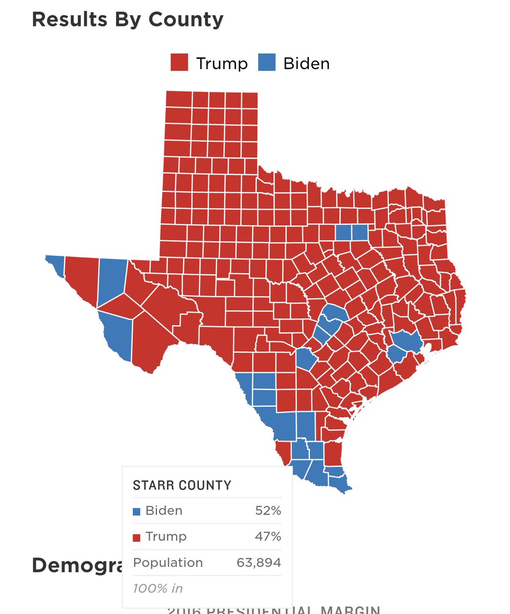 If you're going to say Biden was fine because he had a big TV budget as opposed to down-ballot Democrats, well first of all so did many downballot Democrats, and second of all, you should probably cite places where Biden didn't UNDER-perform downballot, unlike Starr County Texas.