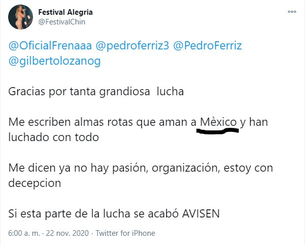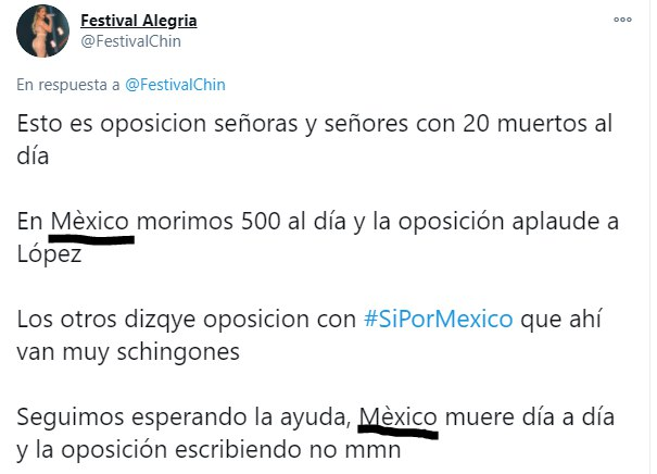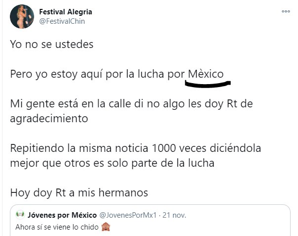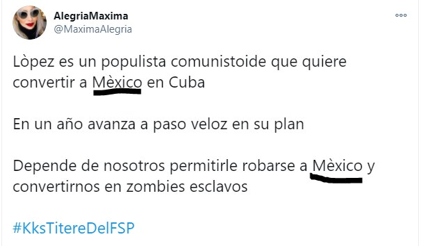 La cuenta superactiva contra AMLO, que ya apareció en otros análisis varias veces, Festival Alegría, y que interacciona mucho con todas las "Valkirias", también pone la tilde invertida por defecto.
