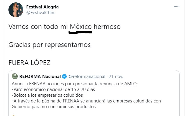 Algunas cuentas que retuitean a la cuenta de Linda Sofía también pone la tilde invertida. Curiosamente esta cuenta también actúa principalmente con las cuentas y medios antiAmlo como Reforma o "Valkirias" de la matriz de opinión como Karen.