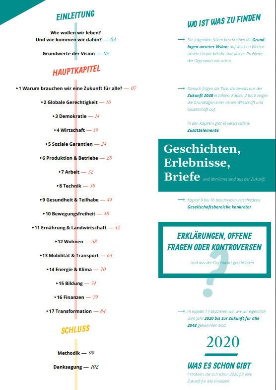 Das Buch »Zukunft für alle« zeigt mögliche Antworten auf diese Fragen auf und stellt basierend auf den Ergebnissen von zwölf Zukunftswerkstätten mit knapp 200 Vordenker*innen eine Vision für das Jahr 2048 dar. /3