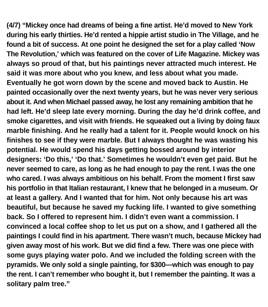 (4/7) “Mickey once had dreams of being a fine artist. He’d moved to New York during his early thirties. He’d rented a hippie artist studio in The Village, and he found a bit of success..."