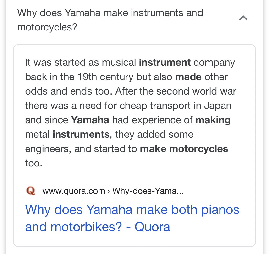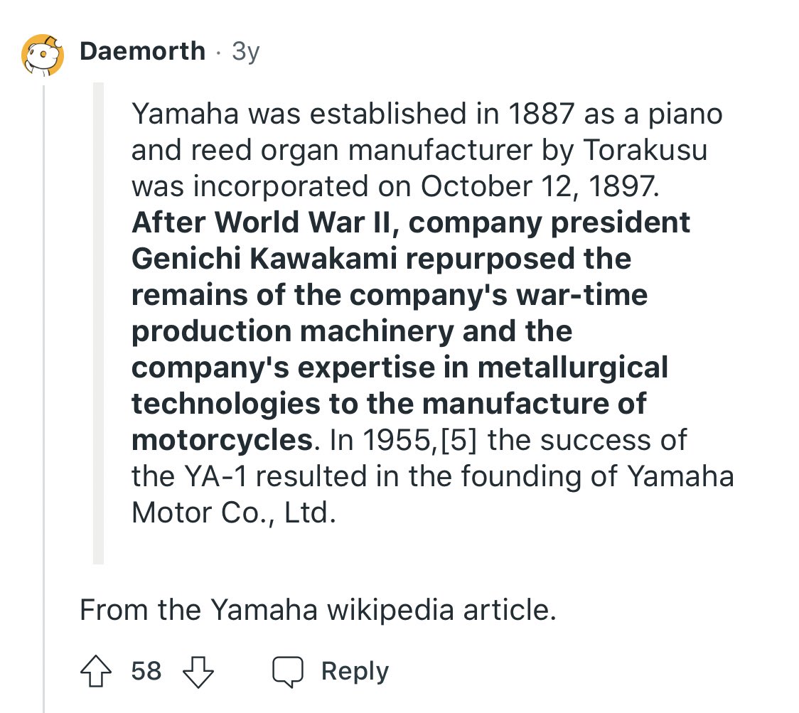 “why does Yamaha makes both musical instruments and motorcycles” has been a vague curiosity on my mind for 15+ years and for some reason I’ve never googled it