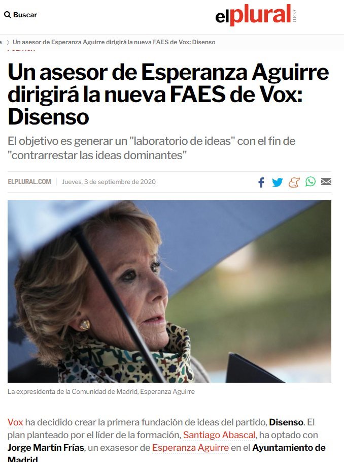 VOX no iba a ser menos y se suma a esta batalla cultural principalmente desde La Gaceta y su fundación Disenso, dirigida por uno de los colaboradores de Esperanza Aguirre y expresidente de la fundación de Atlas network Red Floridablanca, a la que pertenecía Chafuen.