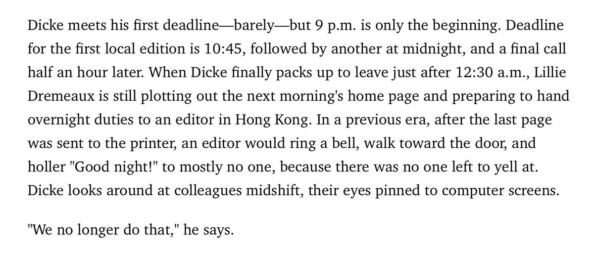 Print deadlines have gotten waaaaay earlier at a lot of papers, though the primary reason is that centralization has meant local papers are now sometimes printed a state or two away. (Like Gannett's Ohio papers now printed in Indianapolis.)