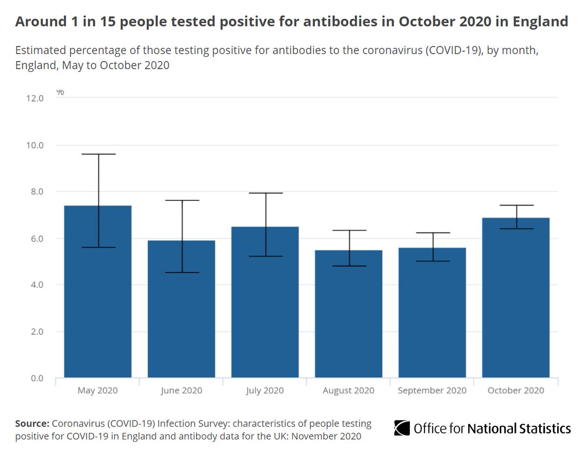In England, around 1 in 15 people tested positive for #COVID19 antibodies in October, suggesting they previously had the virus.