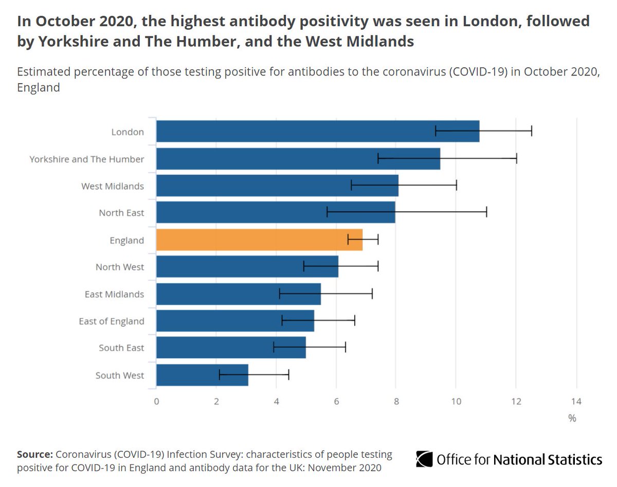 The highest rates of people testing positive for #COVID19 antibodies were seen in London, followed by Yorkshire and The Humber and the West Midlands in October ow.ly/OyTP50Ct8SQ