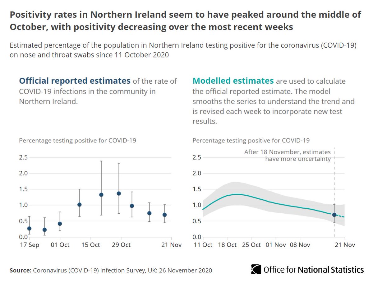 In Northern Ireland in the same week, our modelling shows around 1 in 145 people had #COVID19, or 12,700 people at any given time.