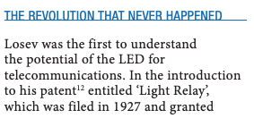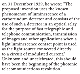 this guy Oleg Vladimirovich Losev invented LEDs decades before everybody else (in the 1920s) but nobody cared. he was a lonely nerd with no co-authors. wrote to einstein but didn't get a reply