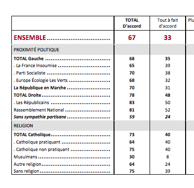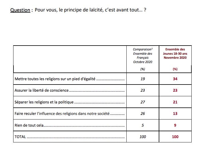 67% des 18-30 ans trouvent justifié que les enseignants montrent des dessins se moquant des religions, mais il existe une vraie fracture avec les jeunes musulmans : seulement 30% d’approbation de leur part. #SamuelPaty