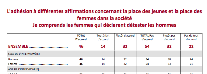46% des 18-30 ans comprennent les femmes qui déclarent détester les hommes. Et ce n’est pas une question de sexe, puisque la proportion est exactement la même chez les hommes et les femmes !