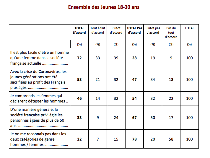 Donc, je précise à la suite de remarques : ce sont les trois premières préoccupations des 18-30 ans PARMI les sujets qui leur sont soumis dans le sondage, bien évidemment, et qui portent surtout sur les discriminations, inégalités et problèmes de société.
