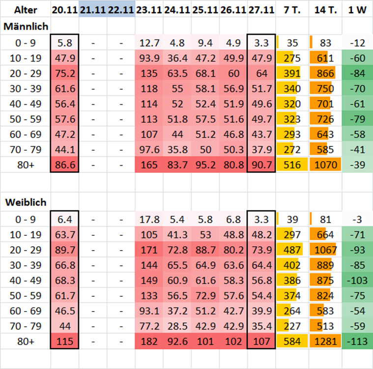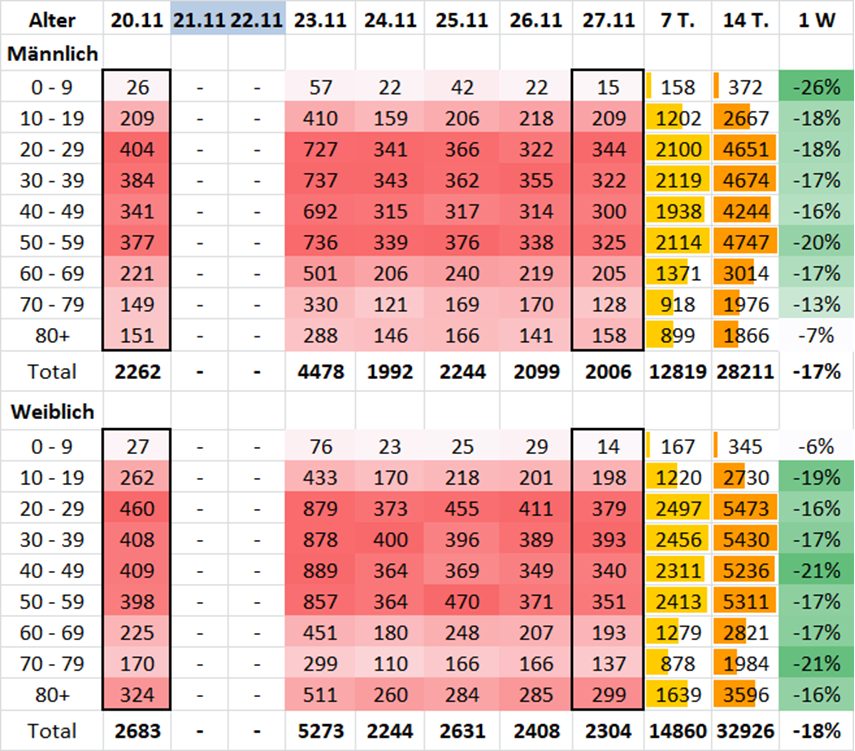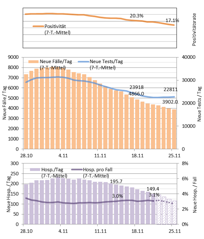 Epidemiologische Kurve der letzten 4 Wochen (bis 25.11./21.11.):