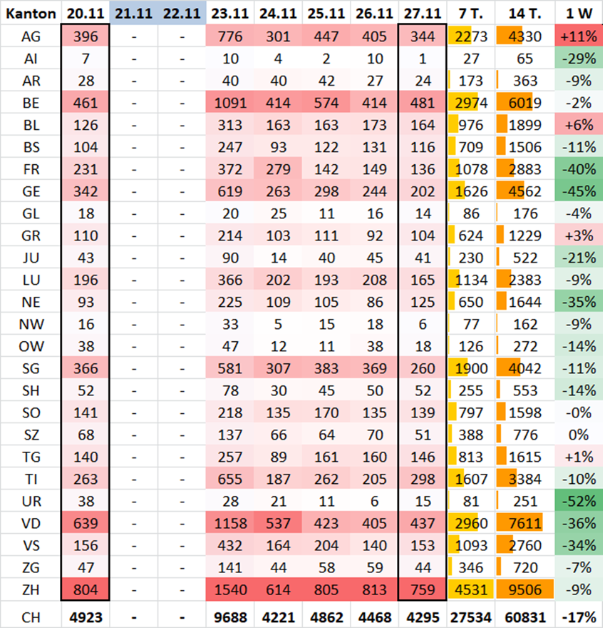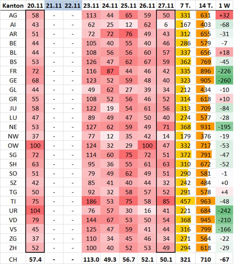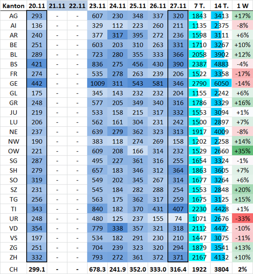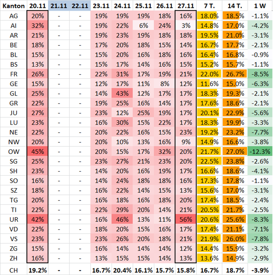 Die Westschweiz ist auf einem höheren Niveau gestartet, hatte bis Ende Okt. ein leicht höheres Wachstum als die übrige CH. Ab Mitte Nov. hat die Westschweiz einen starken Rückgang, der bis jetzt anhält.