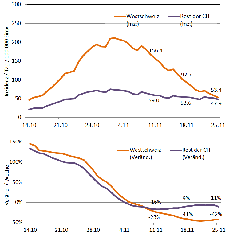 Wirkung der Teil-Lockdowns in der Westschweiz Anfang Nov. auf die Inzidenz.