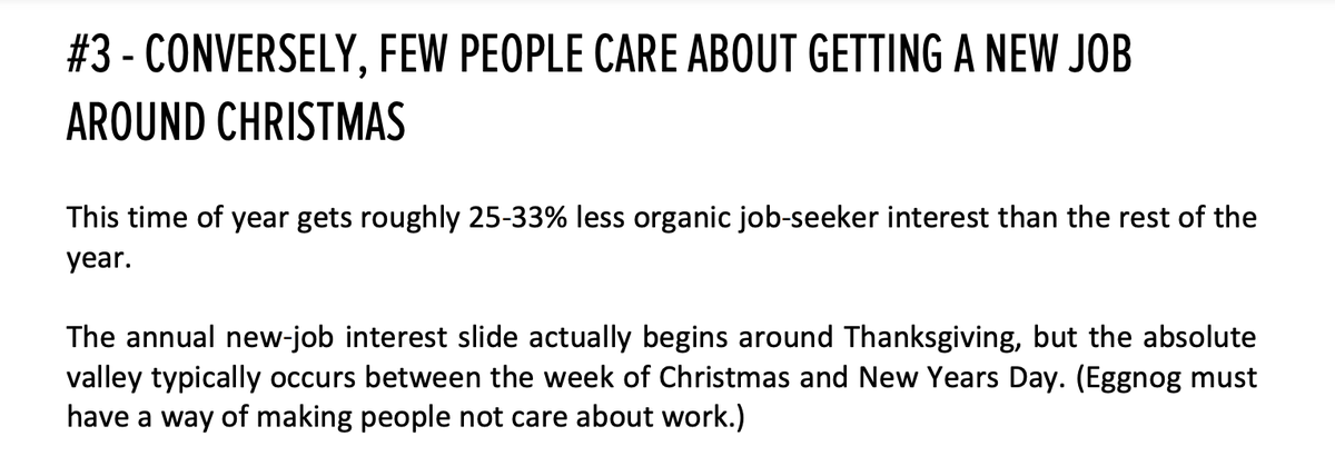 Historically (this is the stat I kept citing internally the last few weeks) the period between Thanksgiving and New Years Day is when the fewest people are in-market for a new job.