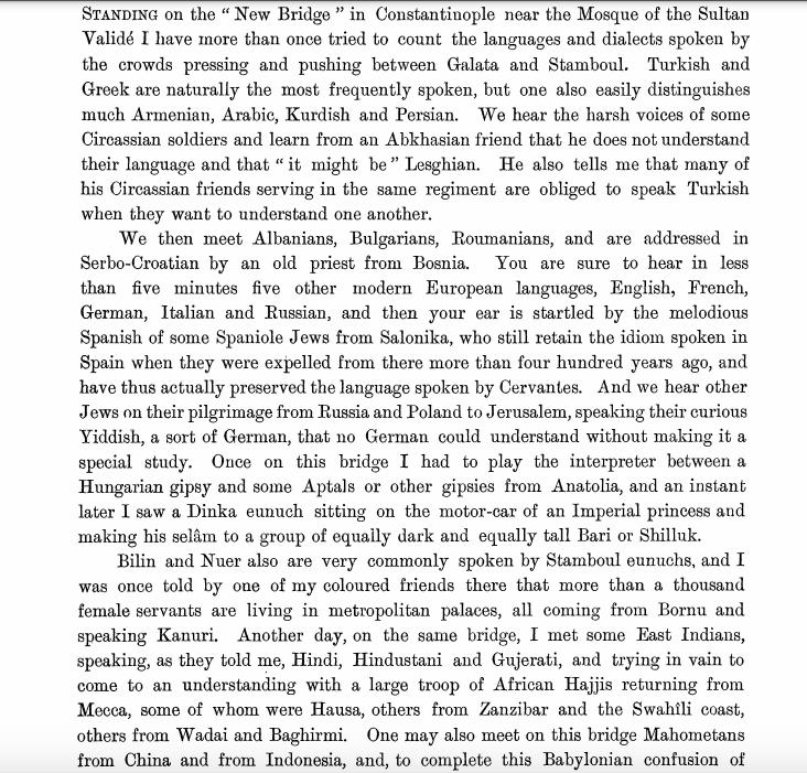 Colourful description of Istanbul's stunning cosmopolitanism at the turn of the century, documenting speakers of Turkish, Greek, Armenian, Kurdish, Arabic, Persian, Ladino, Lezgin, Albanian, Bulgarian, Romanian, Serbo-Croatian, Hungarian, Yiddish, Hindi, Swahili, Bilen, Nuer, etc