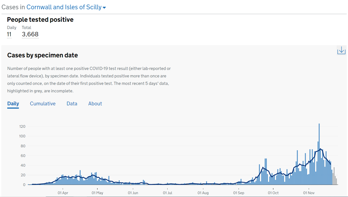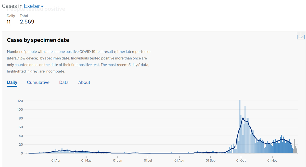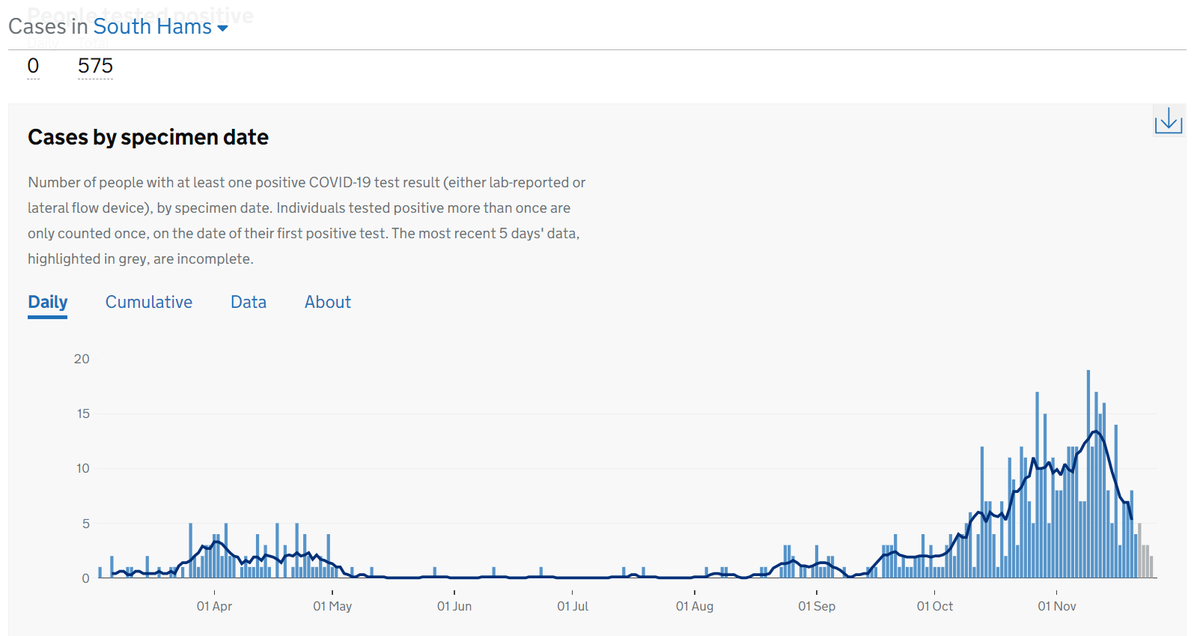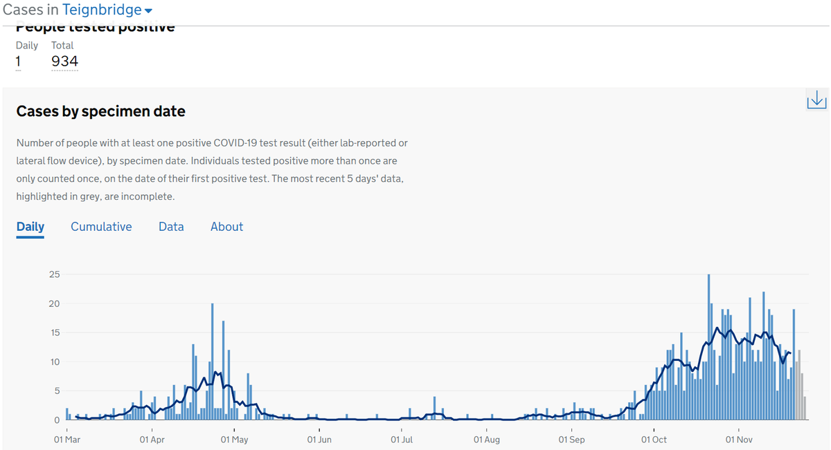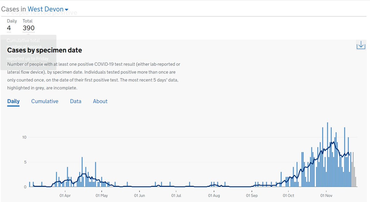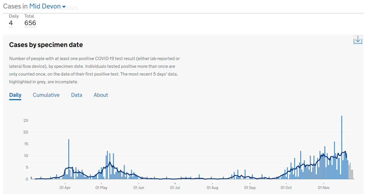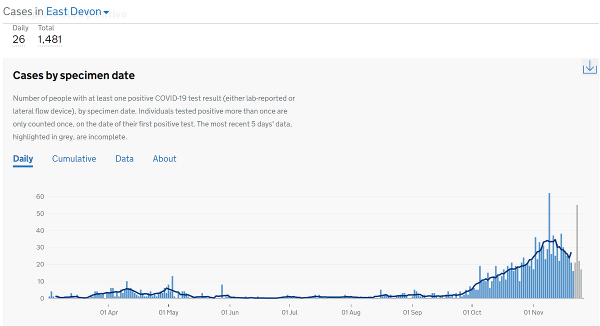 5 in South Hams (4 from Nov 26, 1 from Nov 25), 5 in Teignbridge (4 from Nov 26, 1 from Nov 25), 17 in Torbay (12 from Nov 26, 2 from Nov 25, 3 from Nov 24). And then 39 in North Devon (7 from Nov 26, 9 from Nov 25, 3 from Nov 24 and 23, 2 from Nov 22, 21, 17 and 13.....