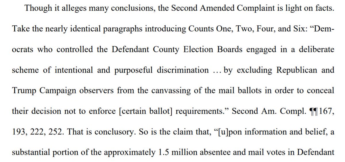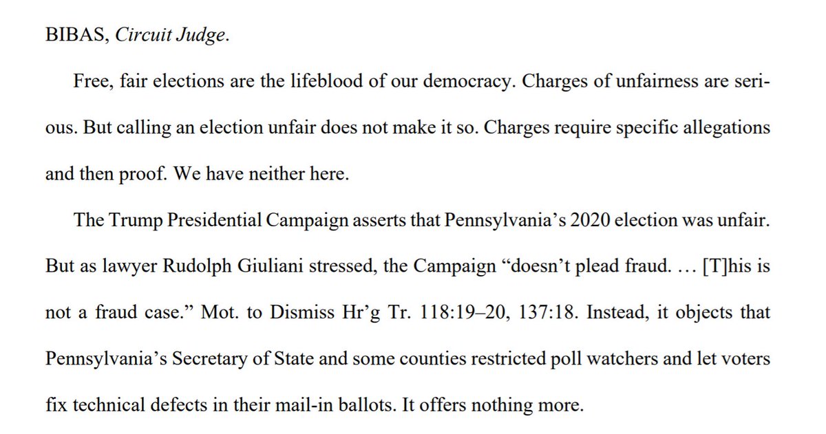 "Free, fair elections are the lifeblood of our democracy. Charges of unfairness are serious. But calling an election unfair does not make it so. Charges require specific allegations and then proof. We have neither here."