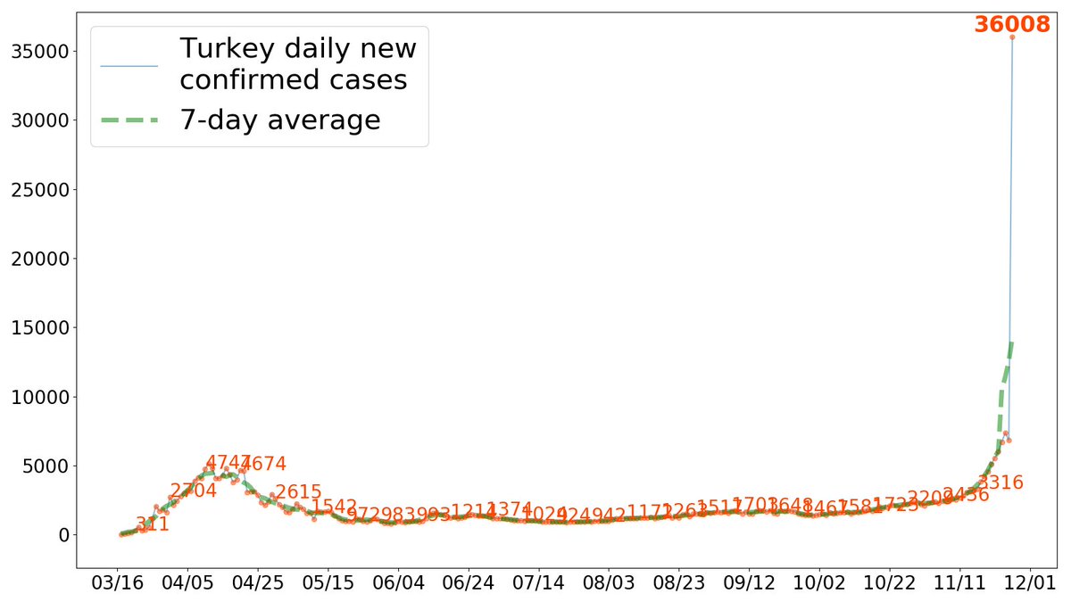 Yesterday Turkey reported 6,713 cases with 153 deaths, both highest since the pandemic. Testing positivity also recently surged.