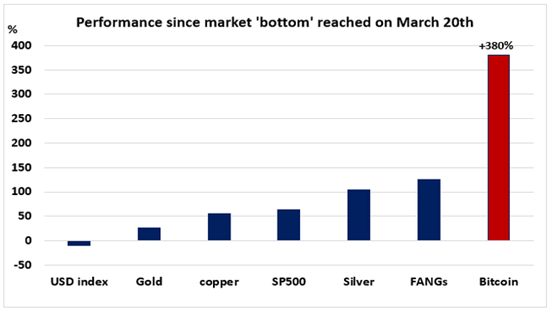 El #BTC#bitcoin ha sido uno de los claros ganadores de este 2020, siendo el activo, con mucho diferencia, que más ha subido desde los mínimos de mercado (3/16)