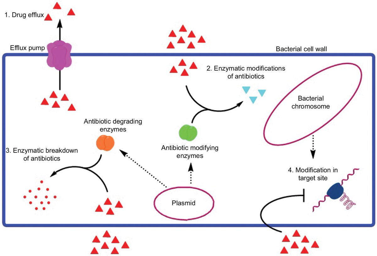 இணைப்பு படம்: பாக்டீரீயாக்கள் எந்த வழிகளிலெல்லாம் Antibiotics ஐ எதிர்க்கிறது என்பதை காட்டுகிறது.