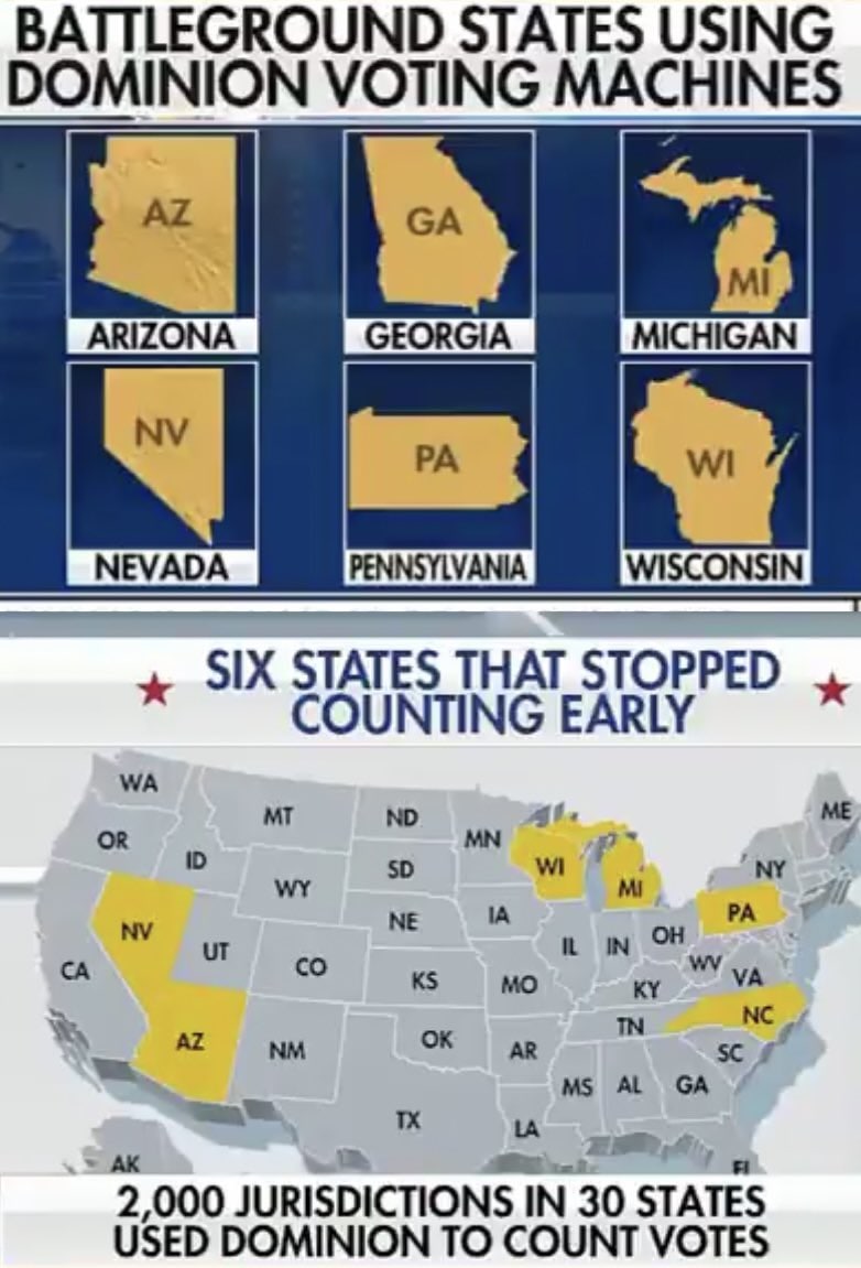 In the election night, the vote counting was stopped in Michigan, Arizona, Nevada, Wisconsin, Georgia and Pennsylvania. Dominion Voting Systems machines were used in all of these states. And they were all connected to the internet and configured to the Serbian IP address, from 👇
