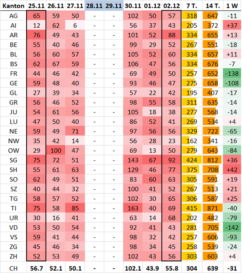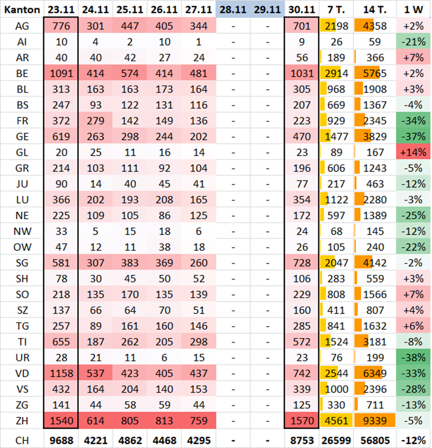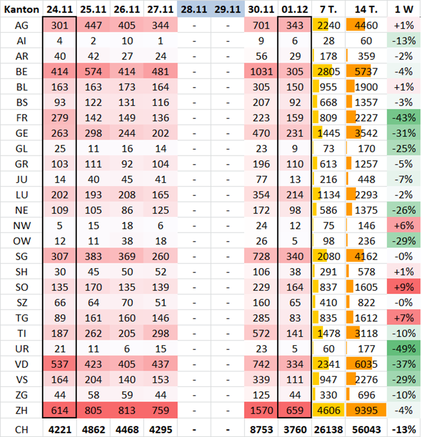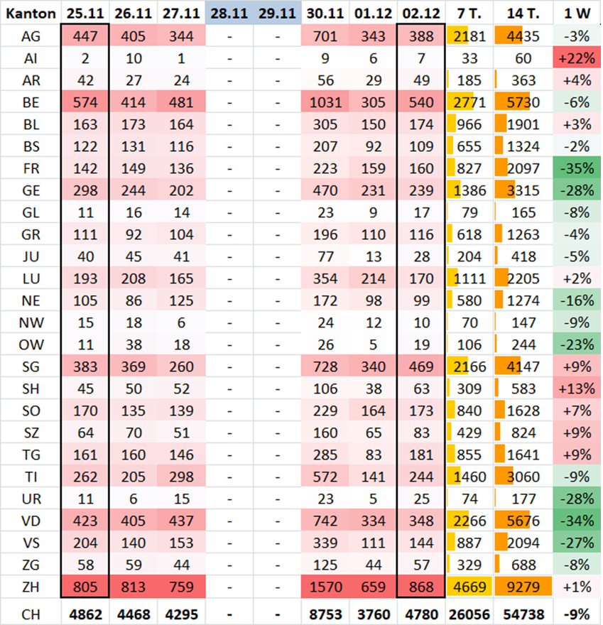 Die Fallzahl ist tiefer als an den letzten zwei Do, wo 6'924 und 5'007 gemeldet wurden.