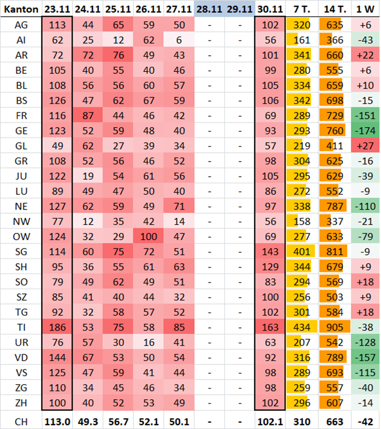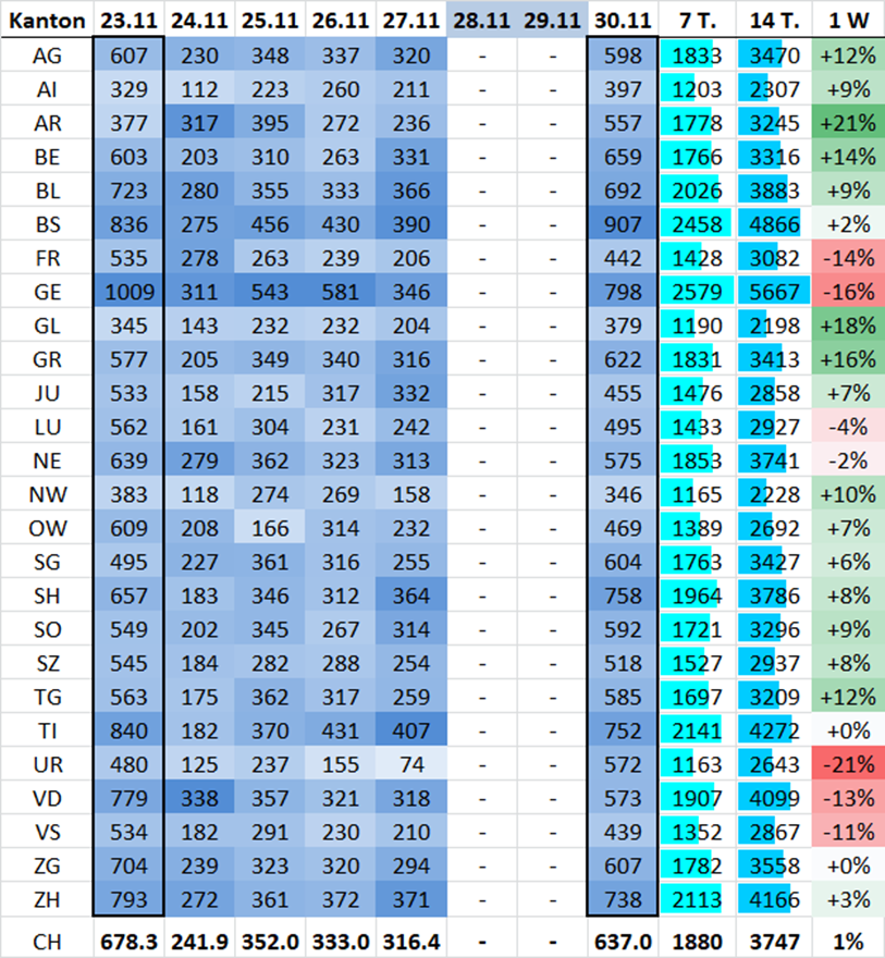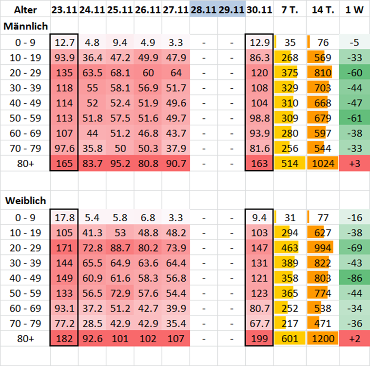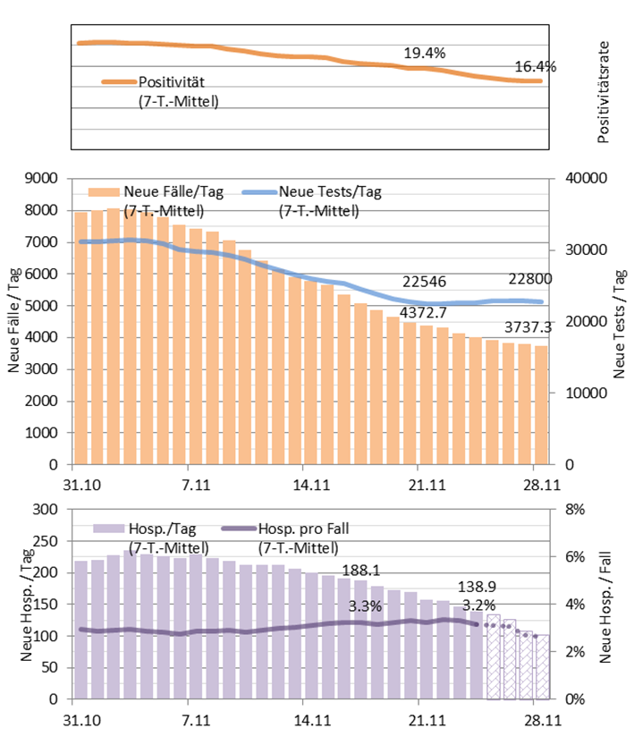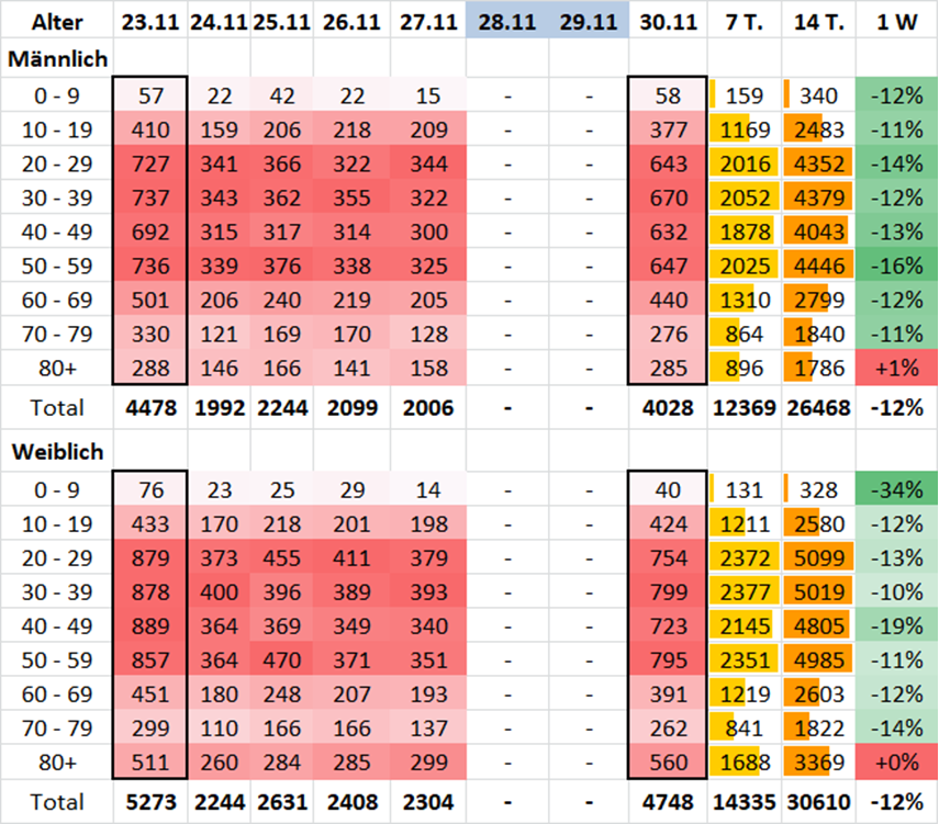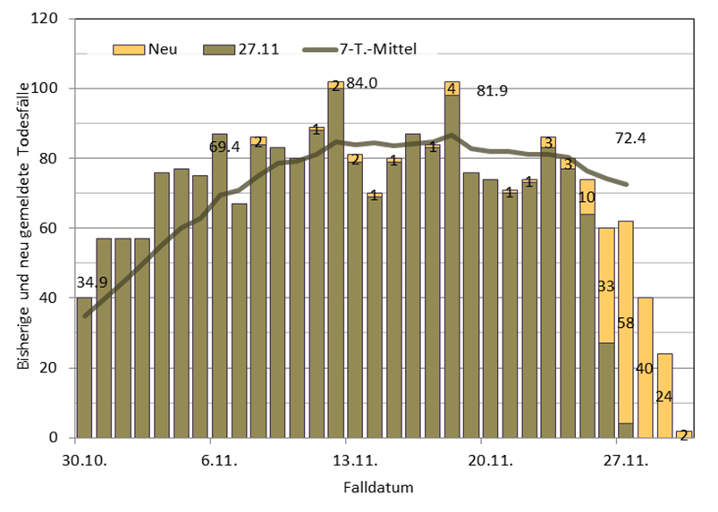 Epidemiologische Kurve der letzten 4 Wochen (bis 28.11./24.11.):
