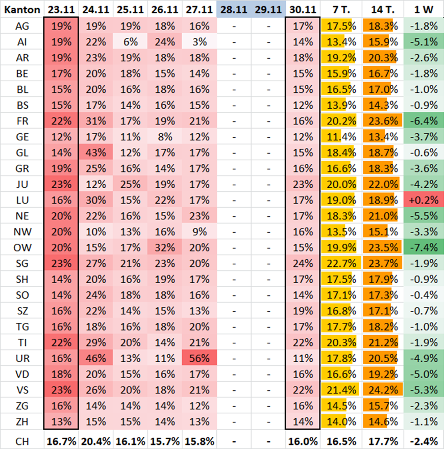 Veränd. in Prozent der Anz. Fälle pro Kanton in 1 Woche zur Vorwoche: