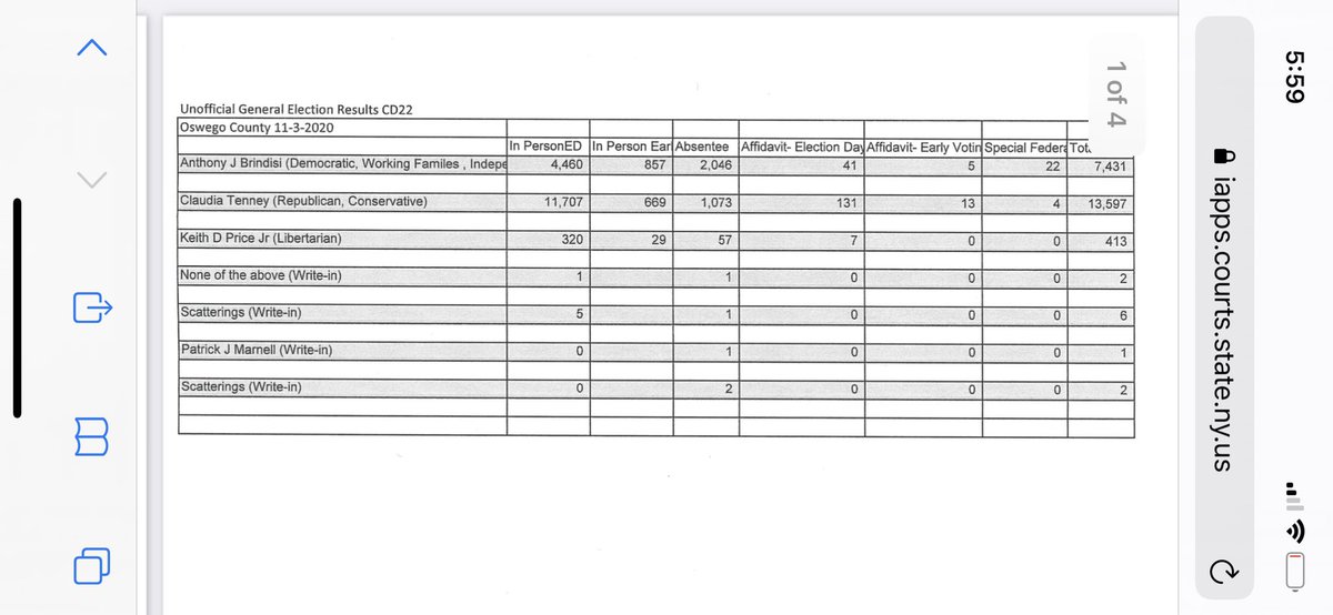 BROOME: Broome County’s updated total have Brindisi with 50713 votes, Tenney with 36595. This includes 112 new votes for the Dem, 257 for the Rep.