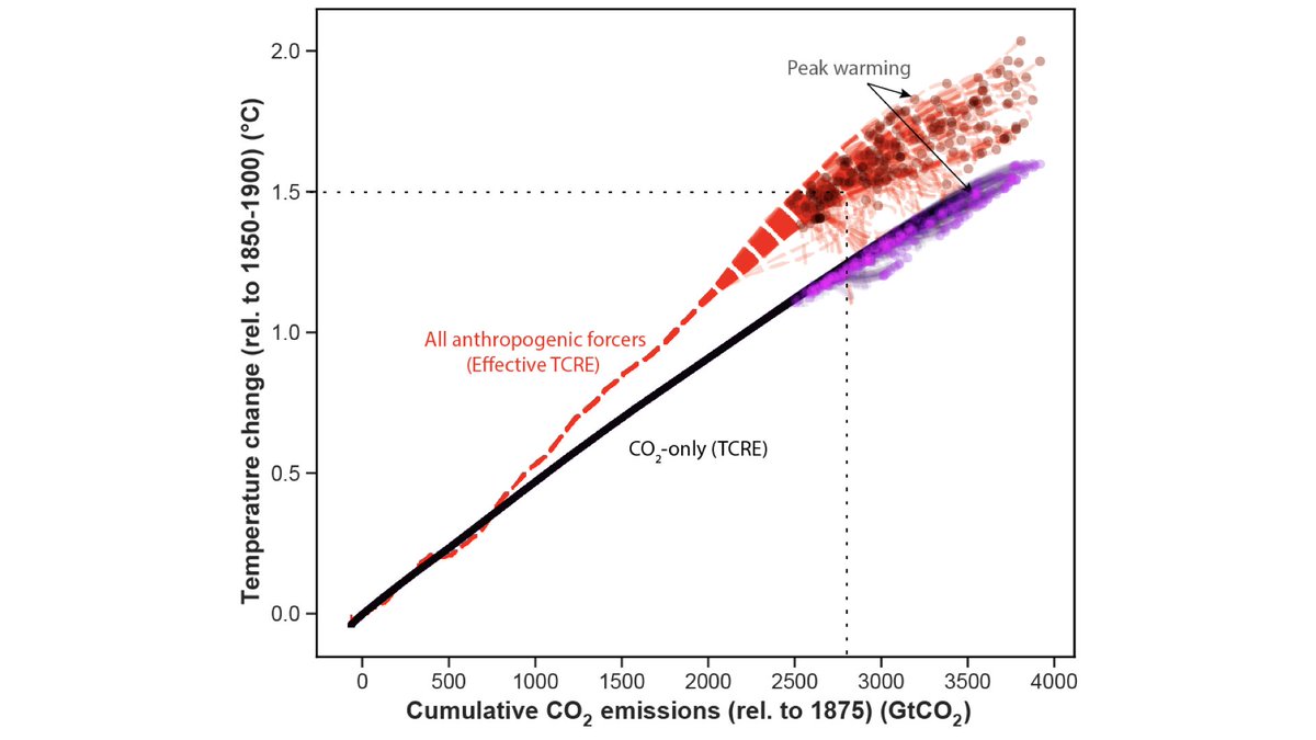 3/ Why is the RCB finite? Each CO2 emission increases global temperature, as per the TCRE (Transient Climate Response to cumulative CO2 Emissions -- a remarkably robust linear relationship, despite many uncertainties). So, stable global temp requires (net)-zero CO2 emissions